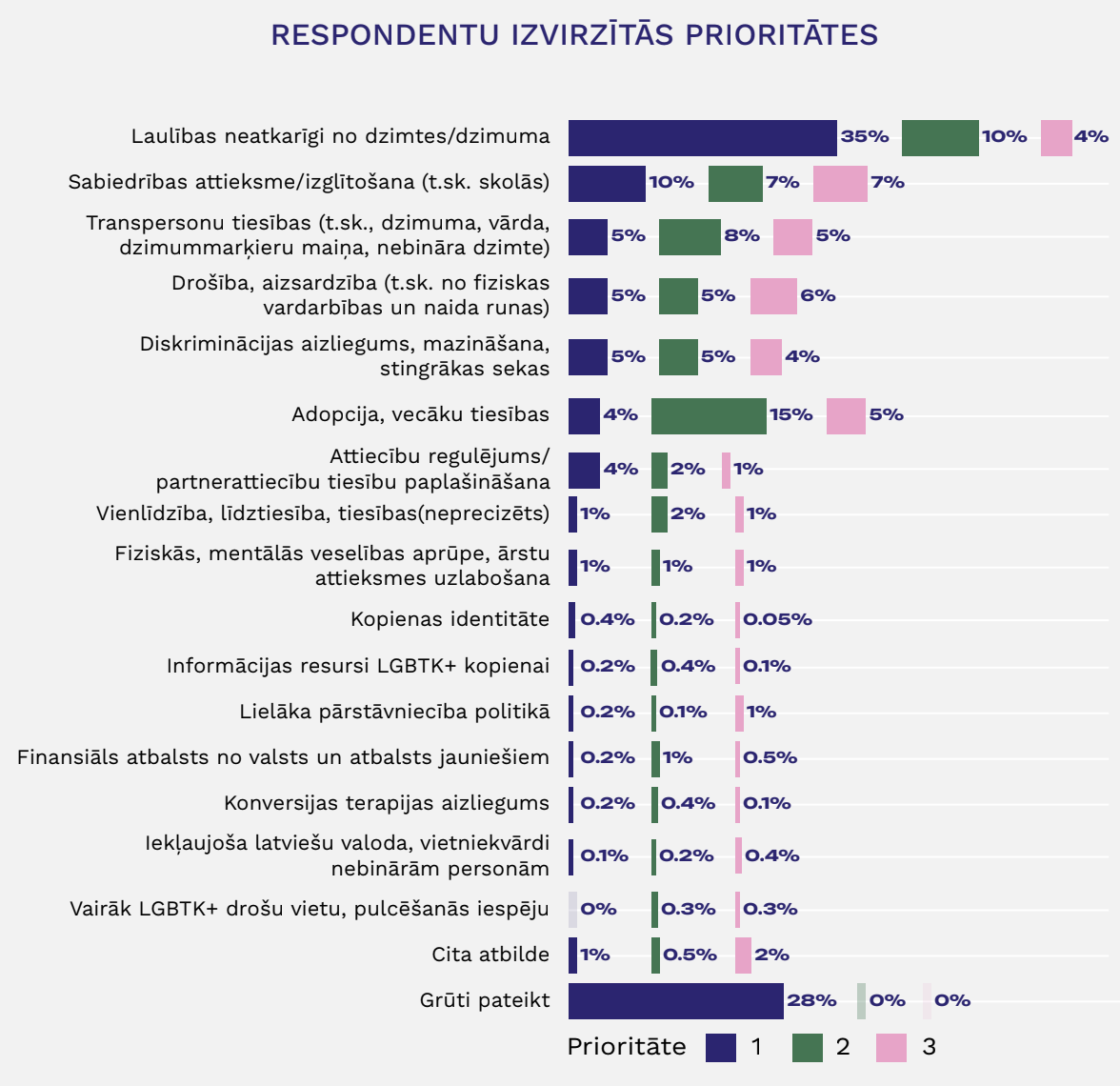 “Mūsu kā šīs konkrētās aptaujas veicēju uzdevums ir ieskicēt darāmo darbu secību, ņemot vērā pašas LGBT+ kopienas izvirzītās prioritātes.” Saskaņā ar aptaujas datiem priekšplānā kā visbiežāk minētā bija laulību vienlīdzība (49%), kam sekoja adopcijas un vecāku tiesības (24%), sabiedrības attieksmes maiņa un izglītošana (23%), transpersonu tiesības (18%) un drošība un aizsardzība (t.sk. no fiziskās vardarbības un naida runas) (16%).